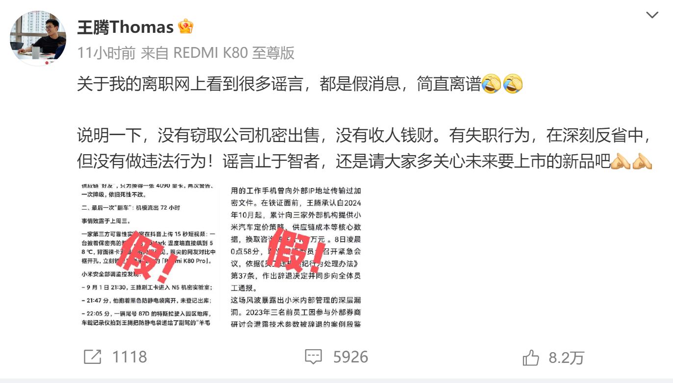 9月9日,王腾亲自下场“辟谣”,否认了窃取公司机密出售以及收人钱财等情况,称确有失职行为,在深刻反省中,“但没有做违法行为”。被王腾“打假”的两条消息分别是收费将未发布真机给数码博主“开箱”、向外部机构提供小米汽车定价等核心数据。至于是否有过提前透露产品细节、芯片细节等,截至发稿王腾未给出对应回应。