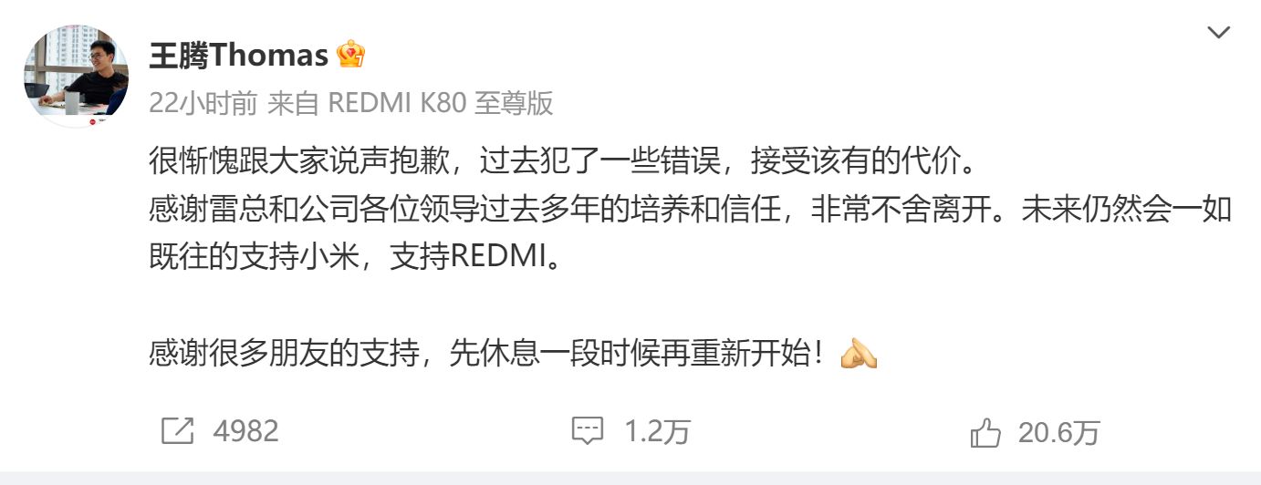 独立电信分析师付亮告诉每经记者,从王腾的两条微博看,有错是明确的,处罚是认可的,双方还是相互体谅的。但同时,解职也是突然的,因为王腾近期一直在准备Redmi的新品发布。